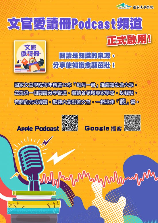 | 二、 | 「文官愛讀冊」Podcast頻道已上線閱讀人鄭俊德介紹每月一書《長思短想》、《愛的藝術》、《寫給公民的40堂思辨課》、《地圖會說話》、《人生就是賽局》以及呂育誠教授導讀《長思短想》上、下集等7段節目,歡迎收聽並訂閱追蹤。 |