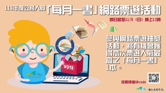 | (五) | 獎勵措施:自全體參與票選活動參加者中,以電腦隨機抽出50名得獎者,致贈得票數最高之「每月一書」圖書1本,國家文官學院預定於112年11月21日公告抽獎結果。 |