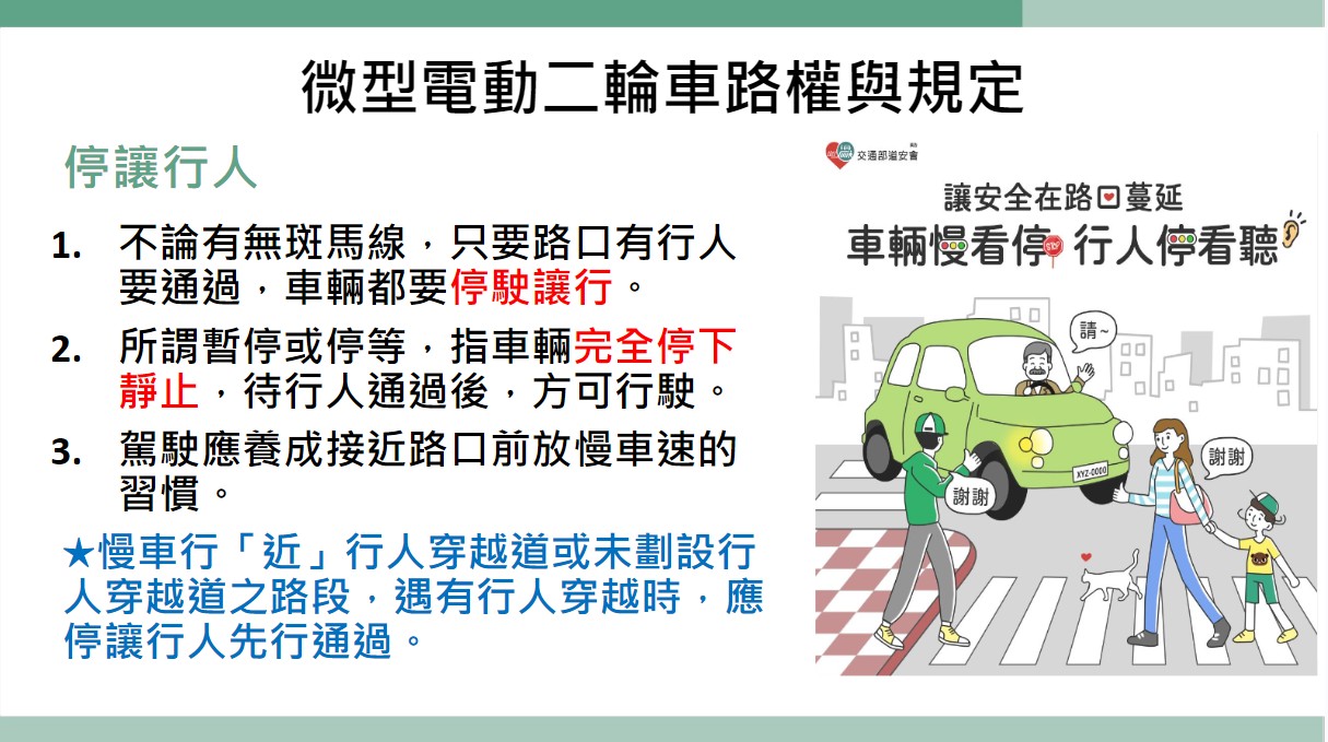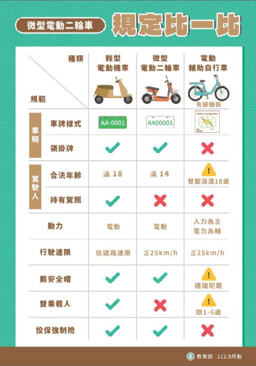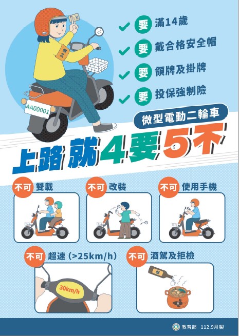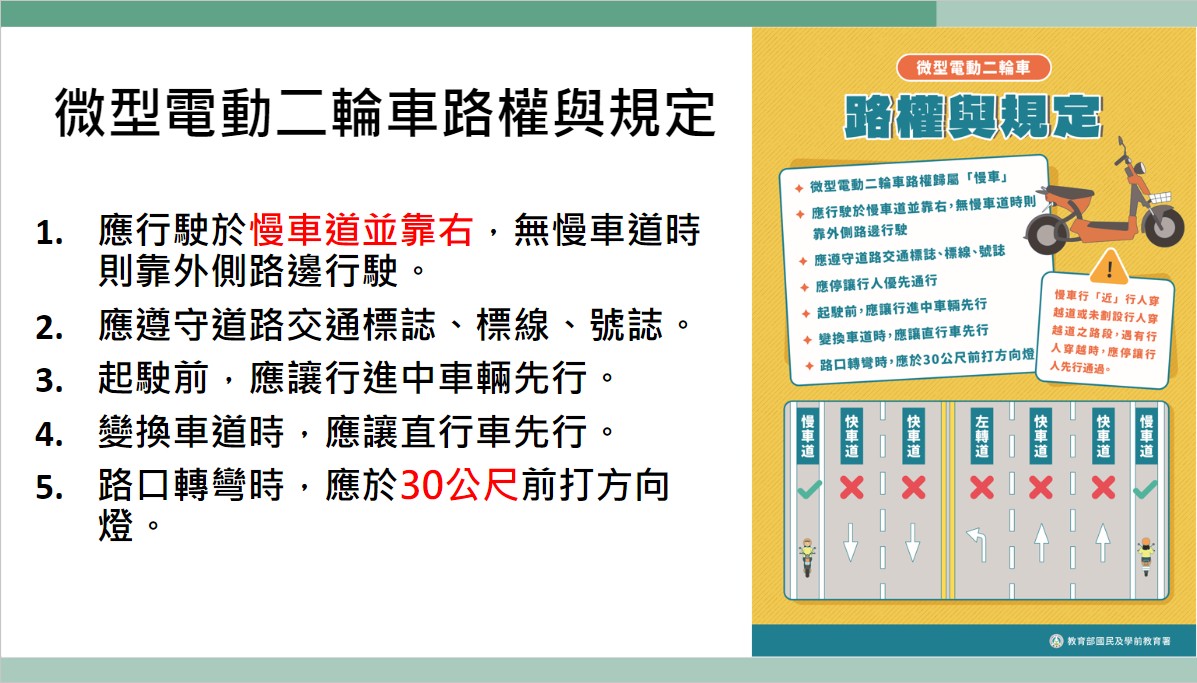 交通安全-微型電動二輪車之駕駛路權與規定(相關訊息取自於教育部國民及學前教育署)