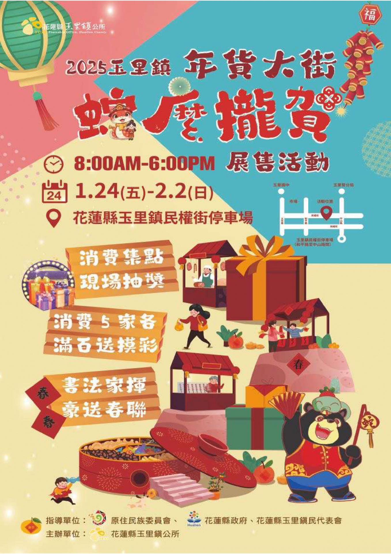 一、本活動訂於114年1月24日(星期五)至2月2日(星期日),共10日(每日上午8時至下午6時),假玉里鎮民權街停車場(和平路至中山路間)辦理。亮點內容有: