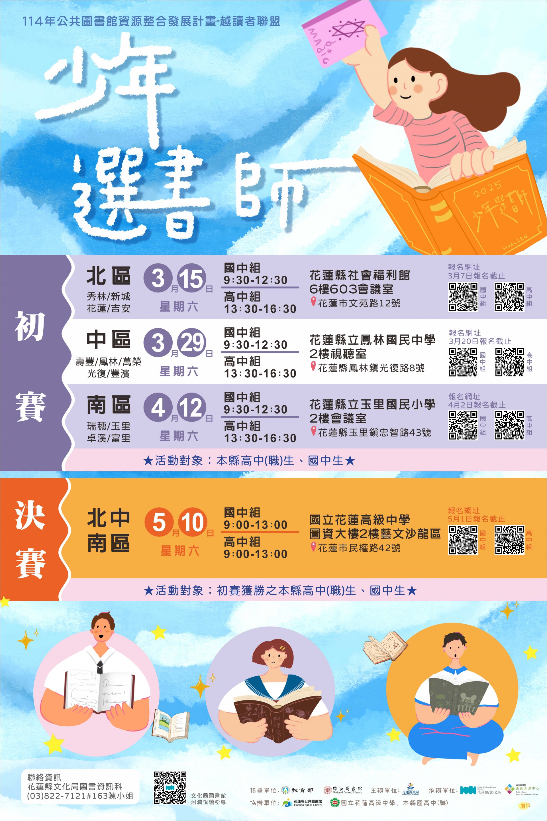 4、北中南區(決);國高中組:訂於114年5月10日(六)上午9時至13時,假國立花蓮高級中學圖資大樓2樓藝文沙龍區(花蓮市民權路42號)辦理。