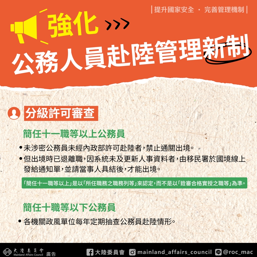| 五、 | 另為利各界瞭解赴陸港澳管理機制,陸委會已製作宣傳圖卡及更新該會官網「公務員赴陸專區/Q&A」(https://www.mac.gov.tw/CSGTC/News.aspx?n=CEE979ACE3148043&sms=CF6C48CEFB93A5EE),供各機關學校內部宣導。 |